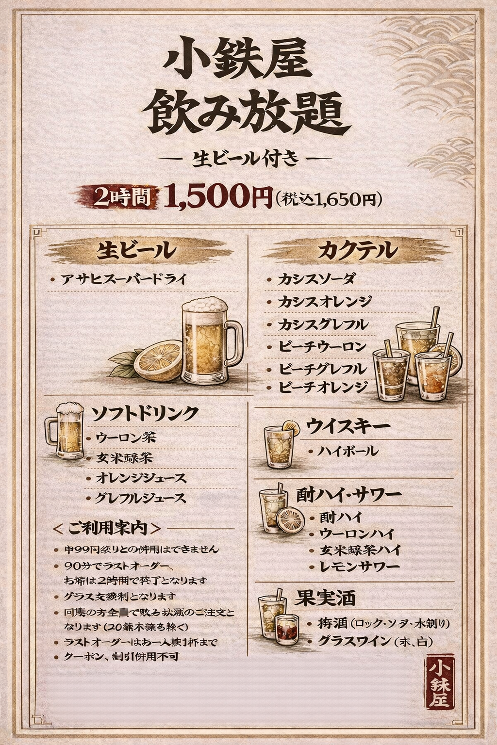 | 料金 | ビールあり1500円(税込み1650円)ビールなし1300円(税込み1430円) |